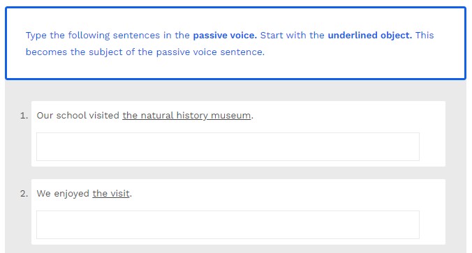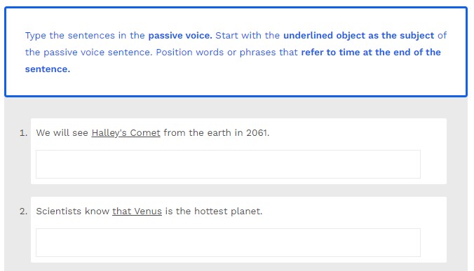 Type the following sentences in the passive voice. Start with the underlined object. This becomes the subject of the passive voice sentence.