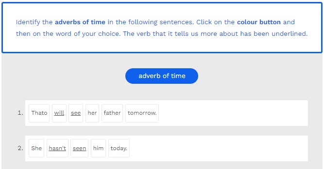 Identify the adverbs of time in the following sentences. Click on the colour button and then on the word of your choice. The verb that it tells us more about has been underlined.