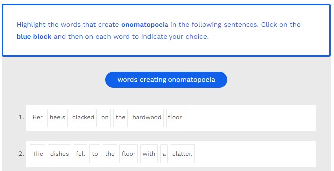 Highlight the words that create onomatopoeia in the following sentences. Click on the blue block and then on each word to indicate your choice.