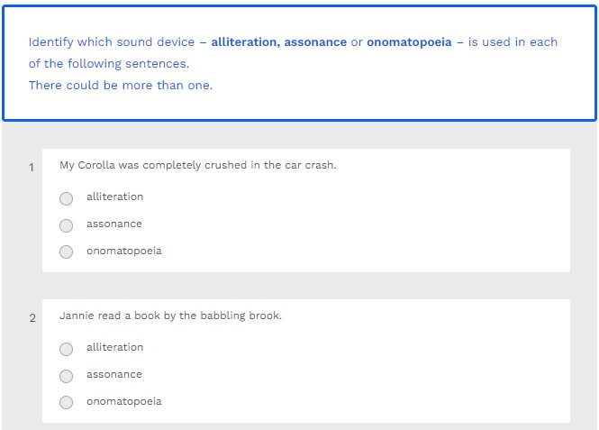 Identify which sound device – alliteration, assonance or onomatopoeia – is used in each of the following sentences.