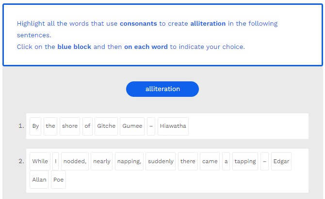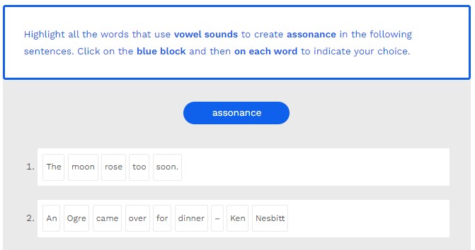 Highlight all the words that use vowel sounds to create assonance in the following sentences. Click on the blue block and then on each word to indicate your choice.