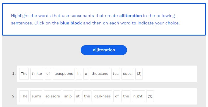 Highlight the words that use consonants that create alliteration in the following sentences. The numbers indicate how many you should find. Click on the blue block and then on each word to indicate your choice.