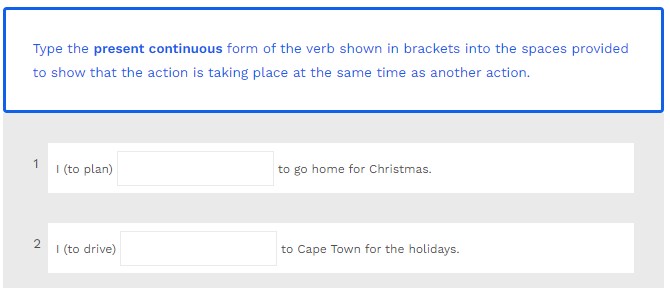 Type the present continuous form of the verb shown in brackets into the spaces provided to show that the action is taking place at the same time as another action.