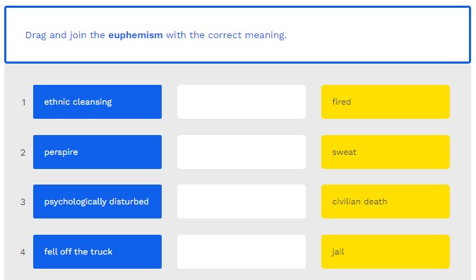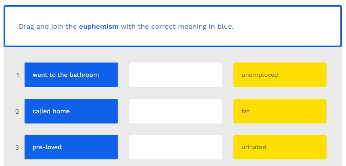 Drag and join the euphemism with the correct meaning in blue.