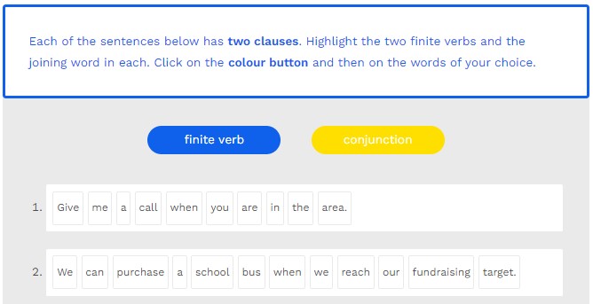 Each of the sentences below has two clauses. Highlight the two finite verbs and the joining word in each. Click on the colour button and then on the words of your choice.