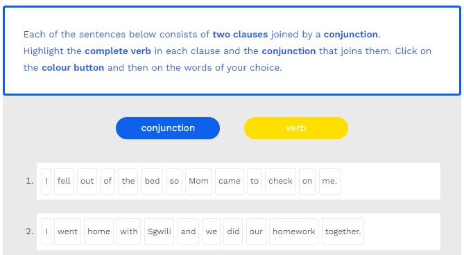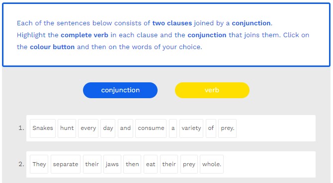 Highlight the complete verb in each clause and the conjunction that joins them. Click on the colour button and then on the words of your choice.