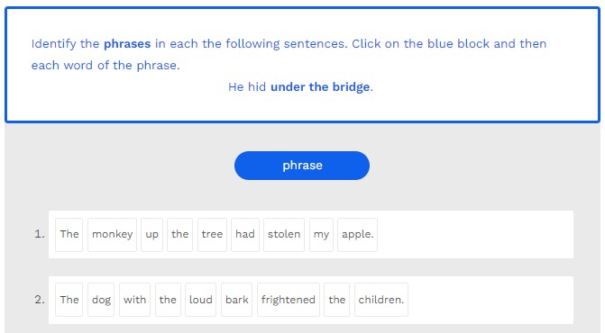 Identify the phrases in each the following sentences. Click on the blue block and then each word of the phrase.