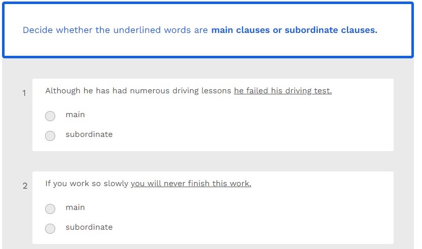 Decide whether the underlined words are main clauses or subordinate clauses.