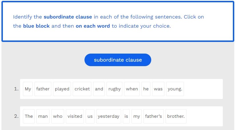 Identify the subordinate clause in each of the following sentences. Click on the blue block and then on each word to indicate your choice.