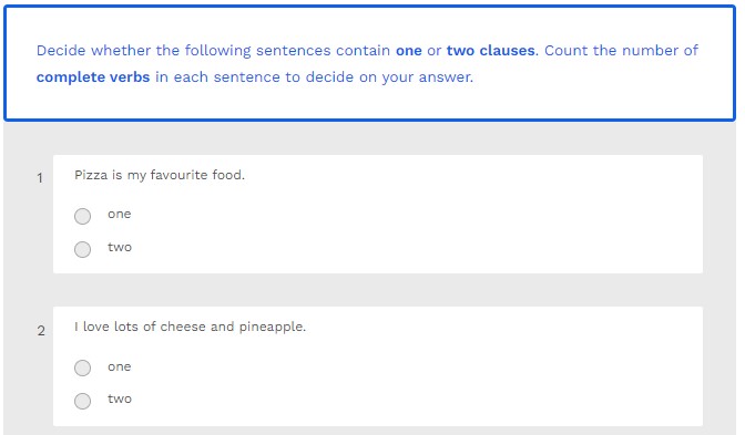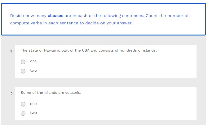 Decide whether the following sentences contain one or two clauses. Count the number of complete verbs in each sentence to decide on your answer.
