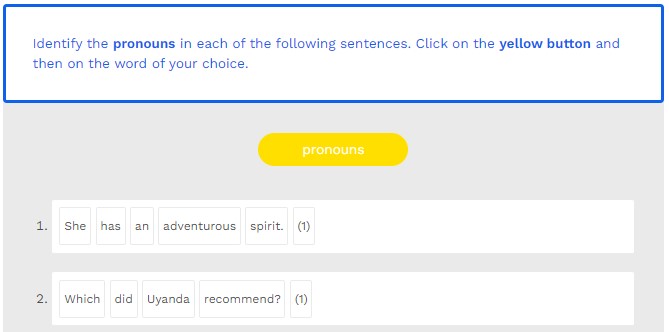 Identify the pronouns in each of the following sentences. Click on the yellow button and then on the word of your choice.