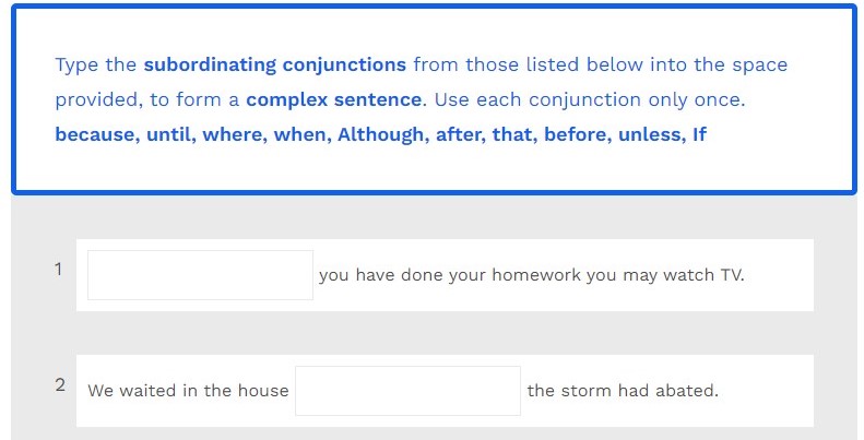 Type the subordinating conjunctions from those listed below into the space provided, to form a complex sentence. Use each conjunction only once.