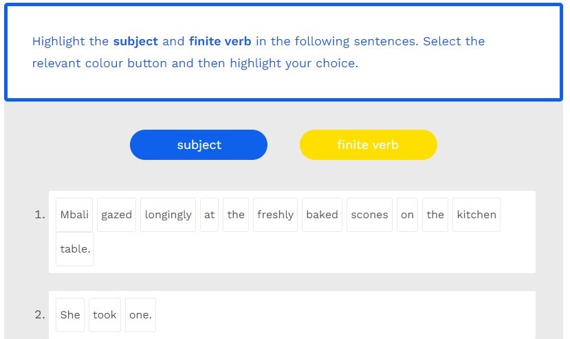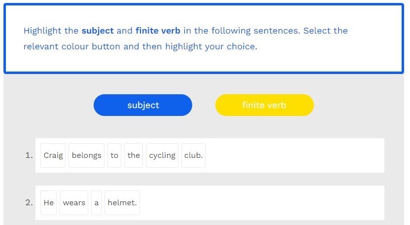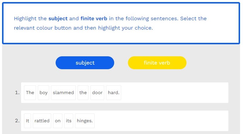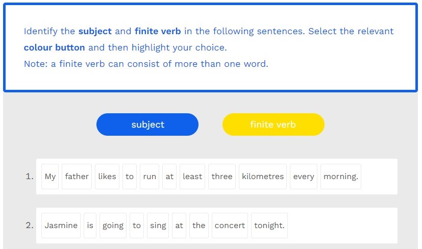 Identify the subject and finite verb in the following sentences. Select the relevant colour button and then highlight your choice.