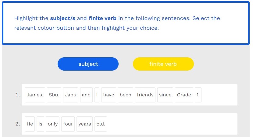 Highlight the subject/s and finite verb in the following sentences. Select the relevant colour button and then highlight your choice.