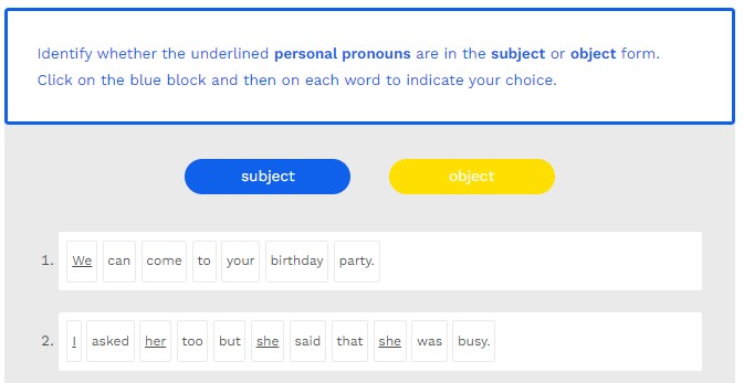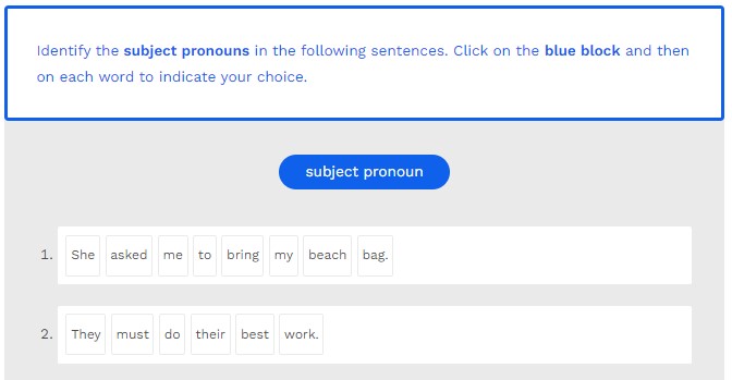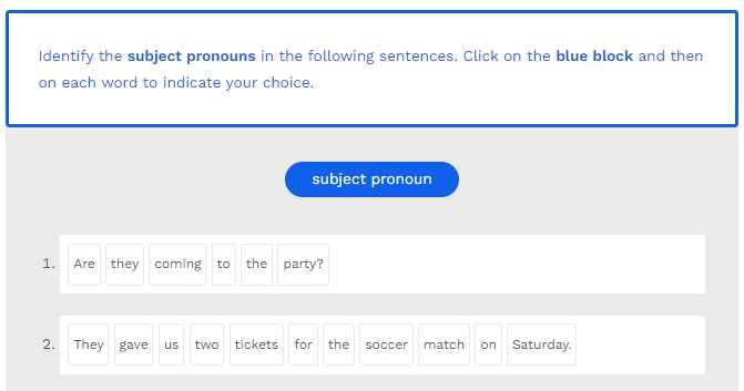 Identify the subject pronouns in the following sentences. Click on the blue block and then on each word to indicate your choice.