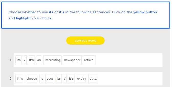 E 1.4 Choose whether to use its or it′s in the following sentences. Click on the yellow button and highlight your choice.