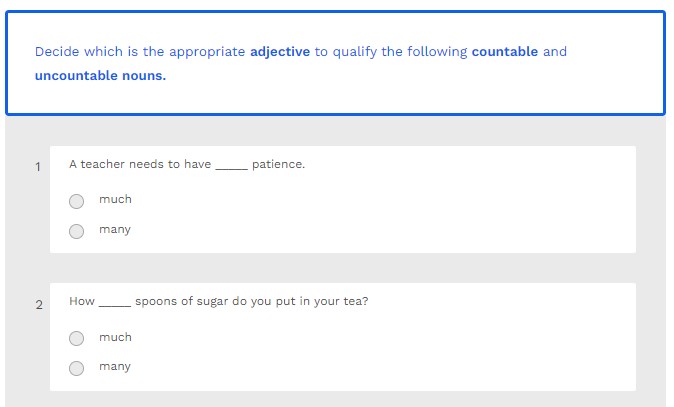 G 5.1 Decide which is the appropriate adjective to qualify the following countable and uncountable nouns.
