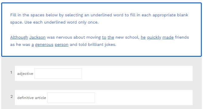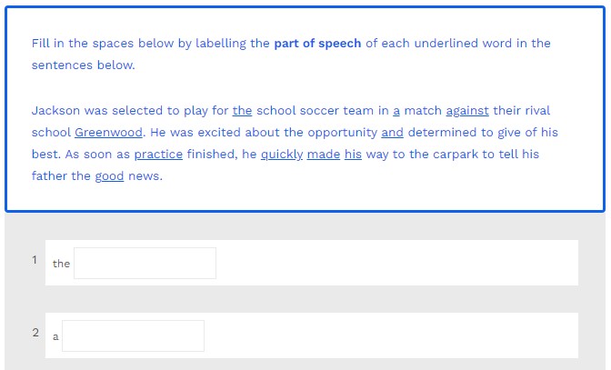 Fill in the spaces below by labelling the part of speech of each underlined word in the sentences below.