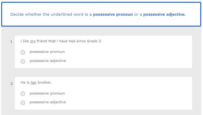 Decide whether the underlined word is a possessive pronoun or a possessive adjective.