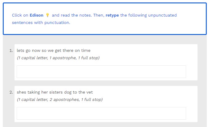 Click on Edison 💡 and read the notes. Then, retype the following unpunctuated sentences with punctuation.