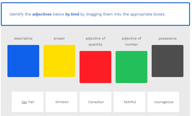Identify the adjectives below by kind by dragging them into the appropriate boxes.