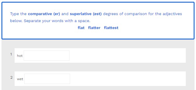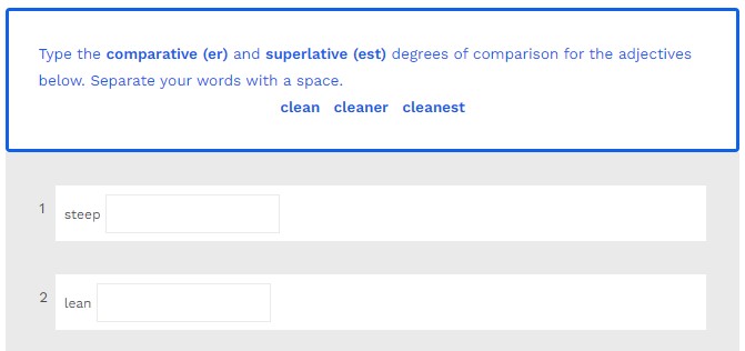 Type the comparative (er) and superlative (est) degrees of comparison for the adjectives below. Separate your words with a space.