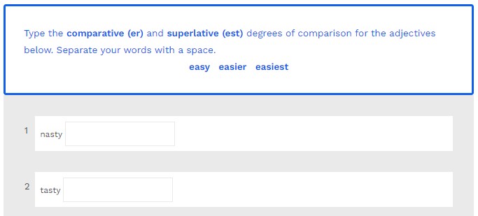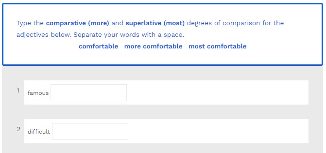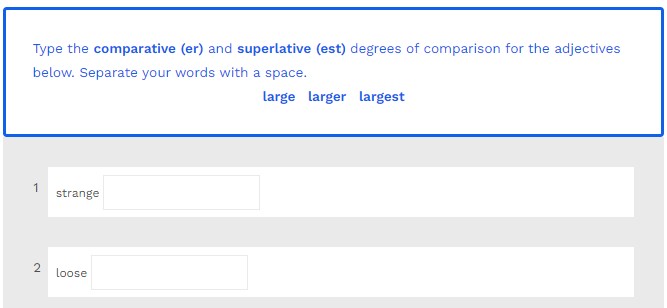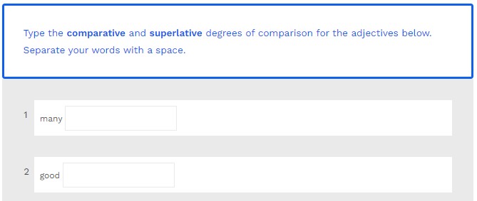 Type the comparative and superlative degrees of comparison for the adjectives below. Separate your words with a space.