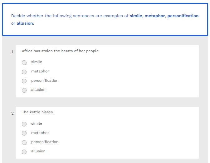 V 1.6 Decide whether the following sentences are examples of simile, metaphor, personification or allusion.