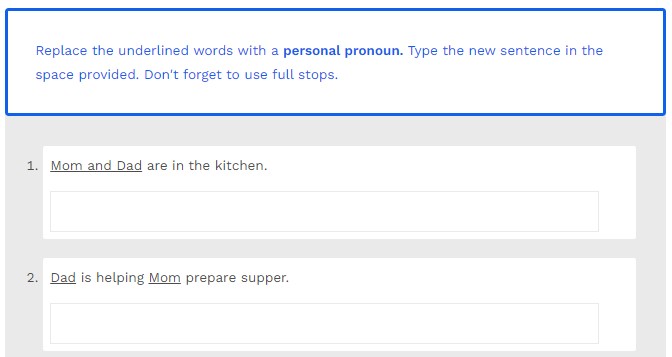 Replace the underlined words with a personal pronoun. Type the new sentence in the space provided. Don′t forget to use full stops.