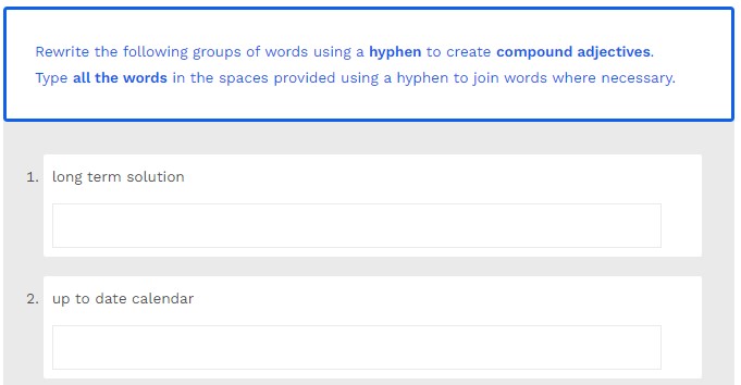 Rewrite the following groups of words using a hyphen to create compound adjectives. Type your answers in the spaces provided.
