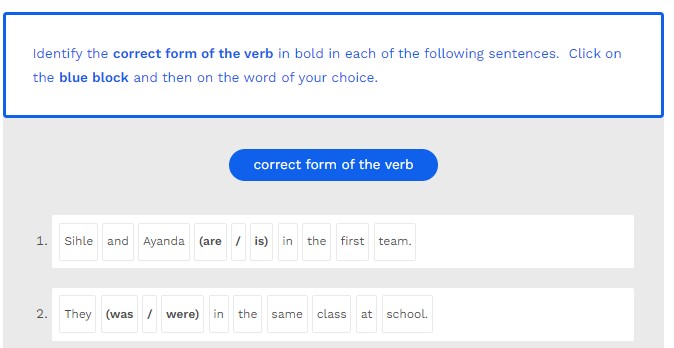 Identify the correct form of the verb in bold in each of the following sentences. Click on the blue block and then on the word of your choice.