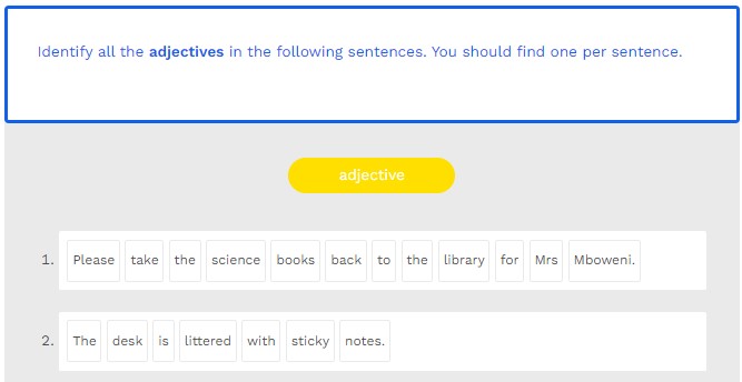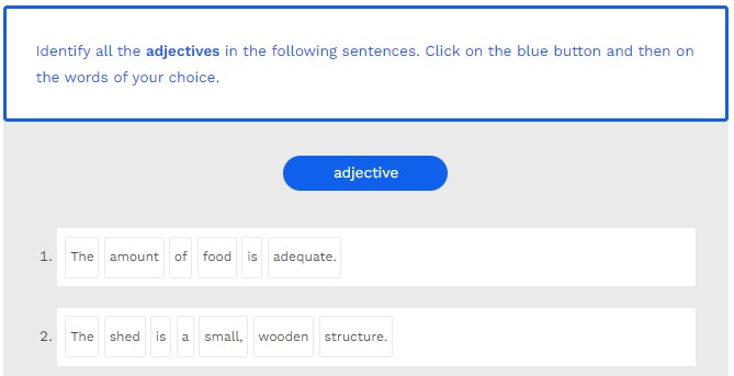 Identify all the adjectives in the following sentences. Click on the blue button and then on the words of your choice.